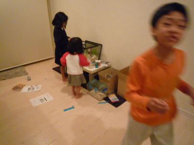 子どもたち、大喜びで水槽をセットしてます。