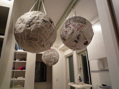 ふくらませた風船に新聞紙を貼っていく、と出ています。