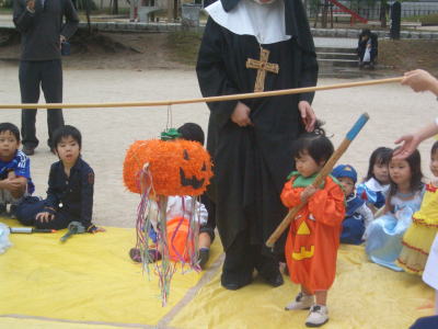 午後に集まり、風船を割って、中身のお菓子などをつめました。