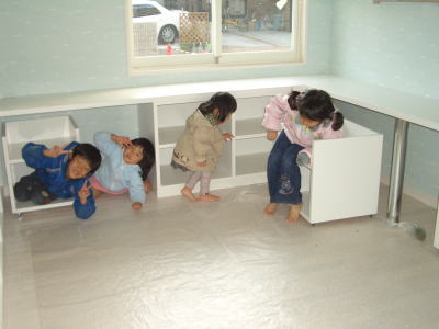 お兄ちゃんだけ戻ってきて、テレビボード、どこをはずすのか探してます。